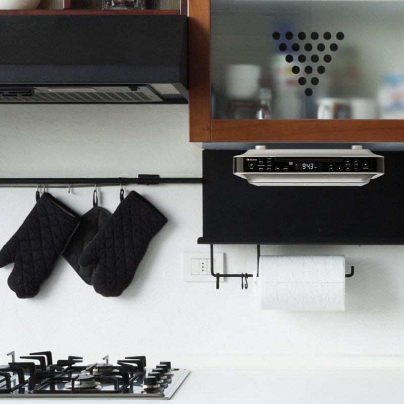 Кухонное радио может быть легко установлено на настенные шкафы. Компактный блок питания с разъемом 90 градусов.