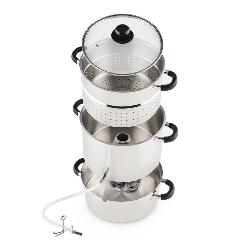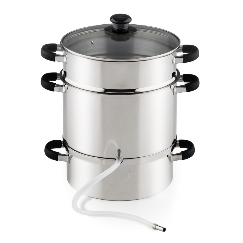 Электрическая паровая соковыжималка для производства собственных фруктовых соков, фрукты выпускают сок в горячем паре, в отличие от соков холодного отжима, при правильной упаковке соки можно хранить месяцами.